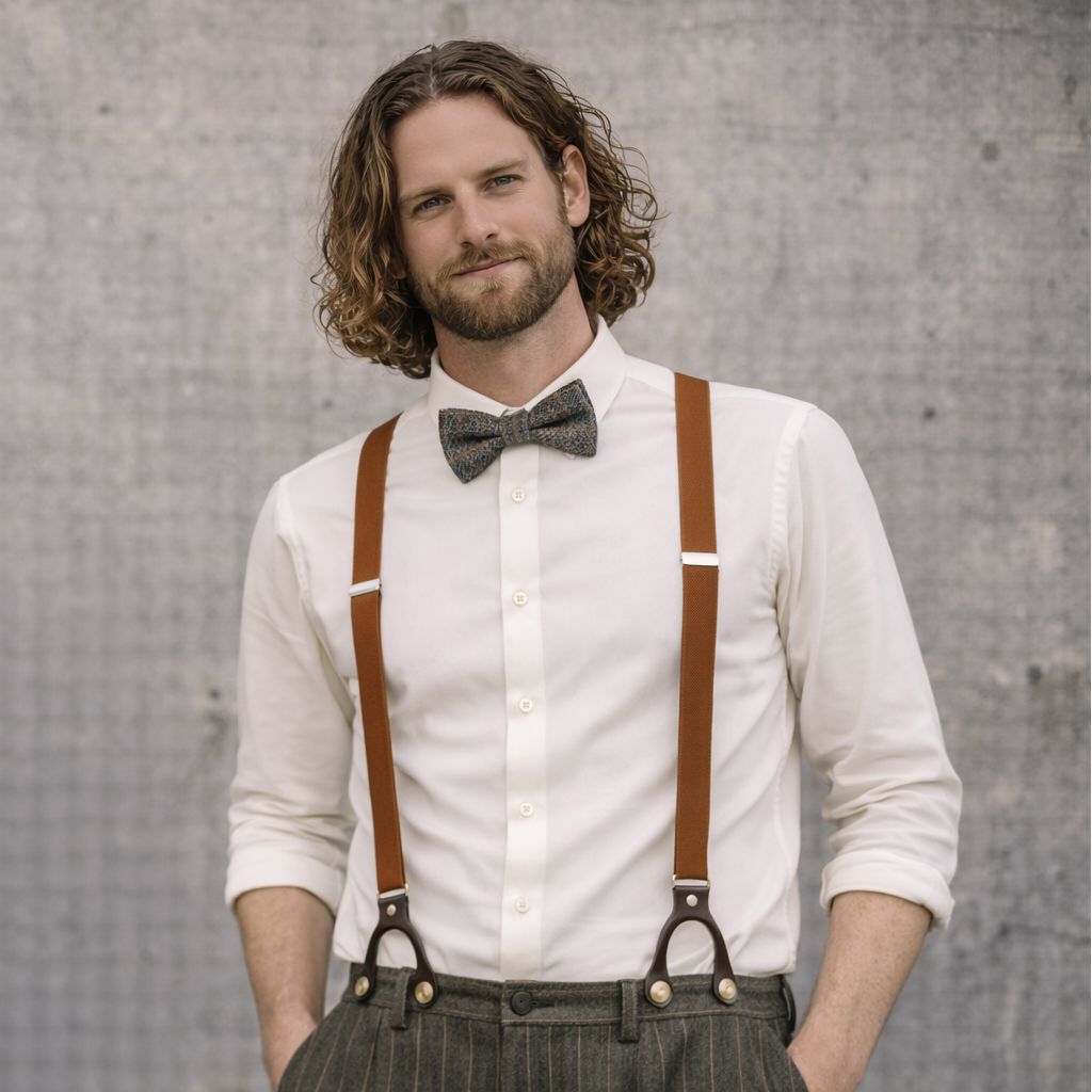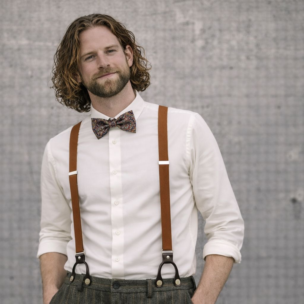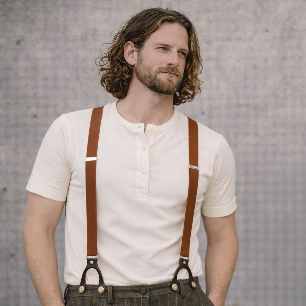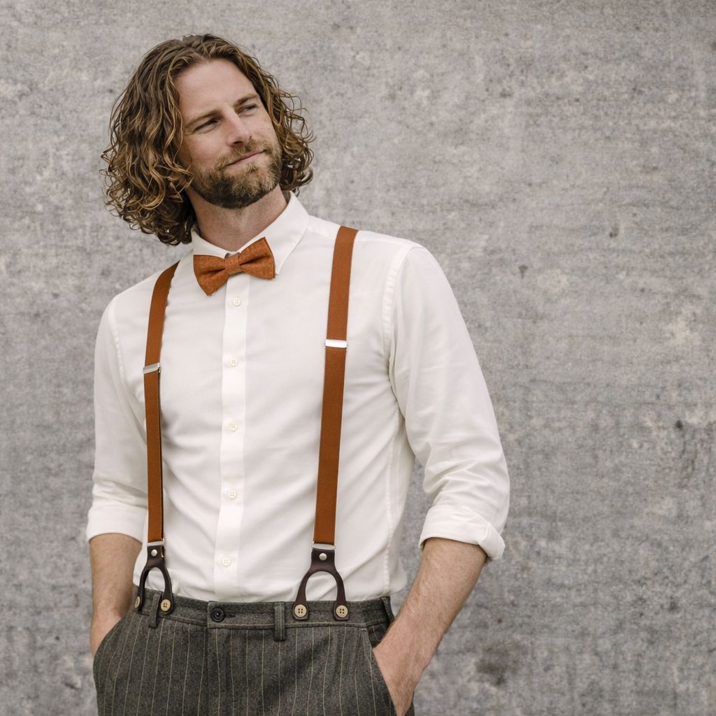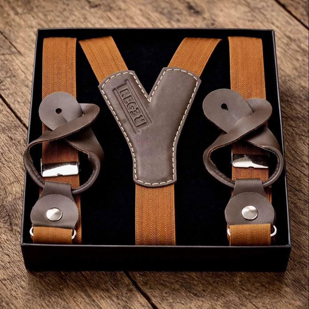 This set includes 6 clamp buttons. This means the strap can be attached to any pair of trousers. The leather Y is made of lambskin and the leather tabs are made of cowhide.